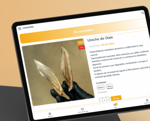 Am implementat, de asemenea, o secțiune personalizată în contul utilizatorului, unde acesta poate introduce informații despre animalul său de companie: nume, vârstă, sex și eventuale alergii. Această funcționalitate permite personalizarea comenzilor și adaptarea lor la nevoile fiecărui patruped.